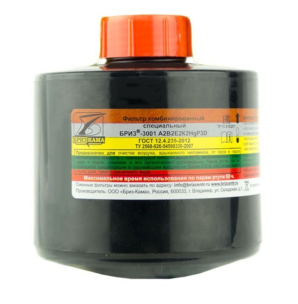 Фильтры комбинированные A2B2E2K2HgP3D Бриз-3001 применяtтся для очистки вдыхаемого загрязненного воздуха от: