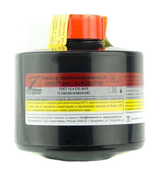 Фильтр комбинированный Бриз-3001 A2B2E2P3D применяется для очистки вдыхаемого загрязненного воздуха от: