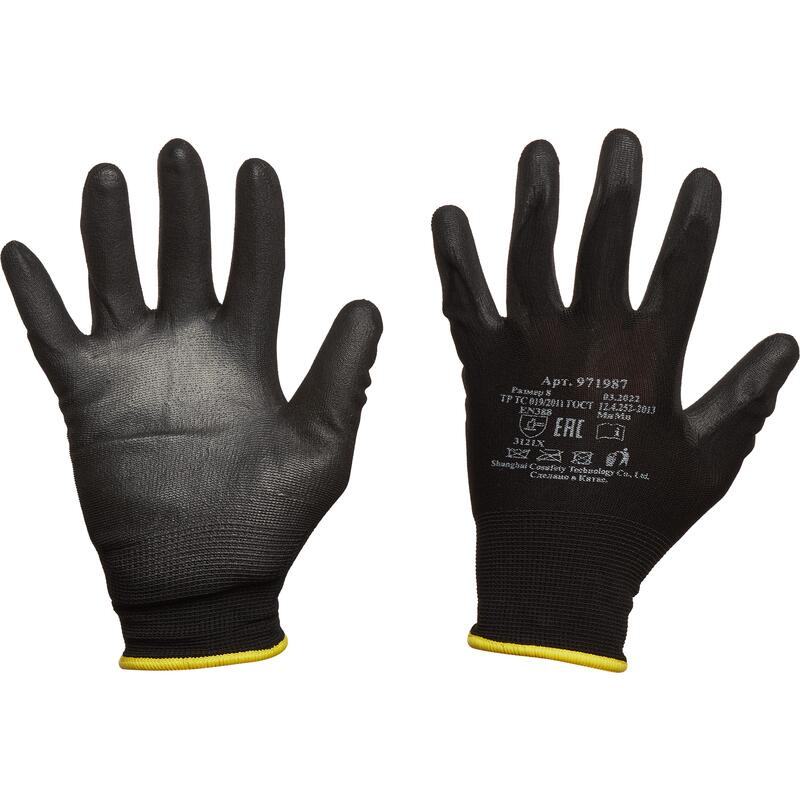Черные нейлоновые перчатки с полиуретановым покрытием ладони и пальцев. Бесшовная «дышащая» основа из нейлона с плотностью вязки 13 петель на дюйм обеспечивает тактильную чувствительность. Полиуретановое покрытие дает эффект «липкости», что исключает проскальзывание предметов. Анатомическая форма снижает усталость рук.
