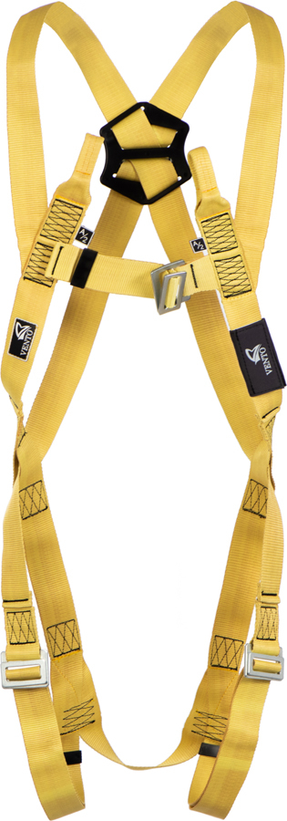 Страховочная точка, расположенная на спине, передвигается под рост пользователя. Ее можно смещать по вертикали на Х-образных плечевых лямках для корректировки правильного положения.