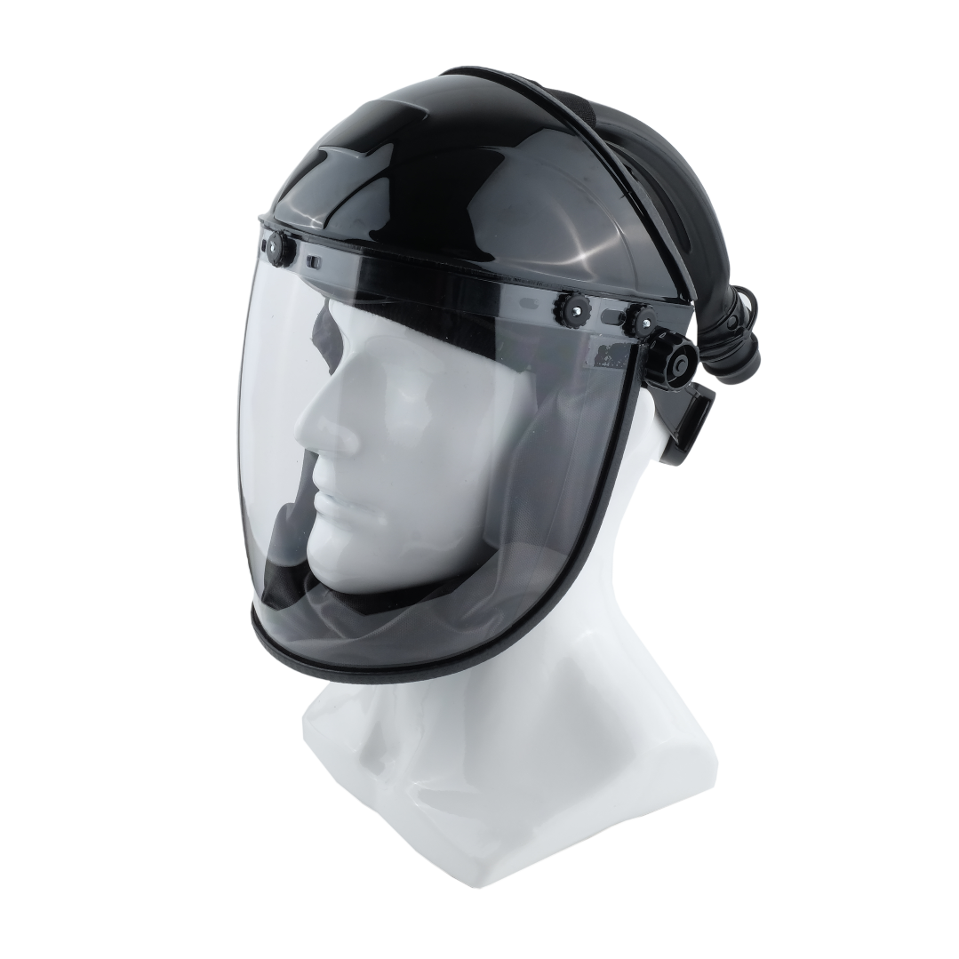 Щиток состоит из бесцветного защитного экрана c антиабразивным покрытием, козырька, наголовного крепления, тканевого лицевого уплотнителя, воздуховода с регулировкой направления подаваемого воздуха.